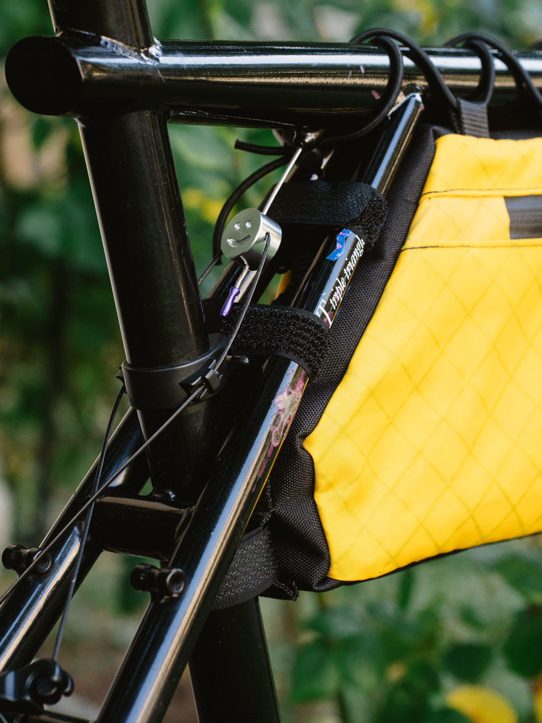 The framebag is laced to the top tube with an elastic cord. This is much kinder to your frame’s paint than velcro straps, spreads the forces evenly and can also serve as an impromptu storage solution: tuck in your jacket when taking off layers or dry your towel after a swim.